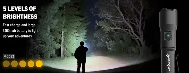 When connected to the charging port, the included Type C cable charges the 18650 3400mAh premium rechargeable Lithium-ion battery that will keep you outdoors even longer.